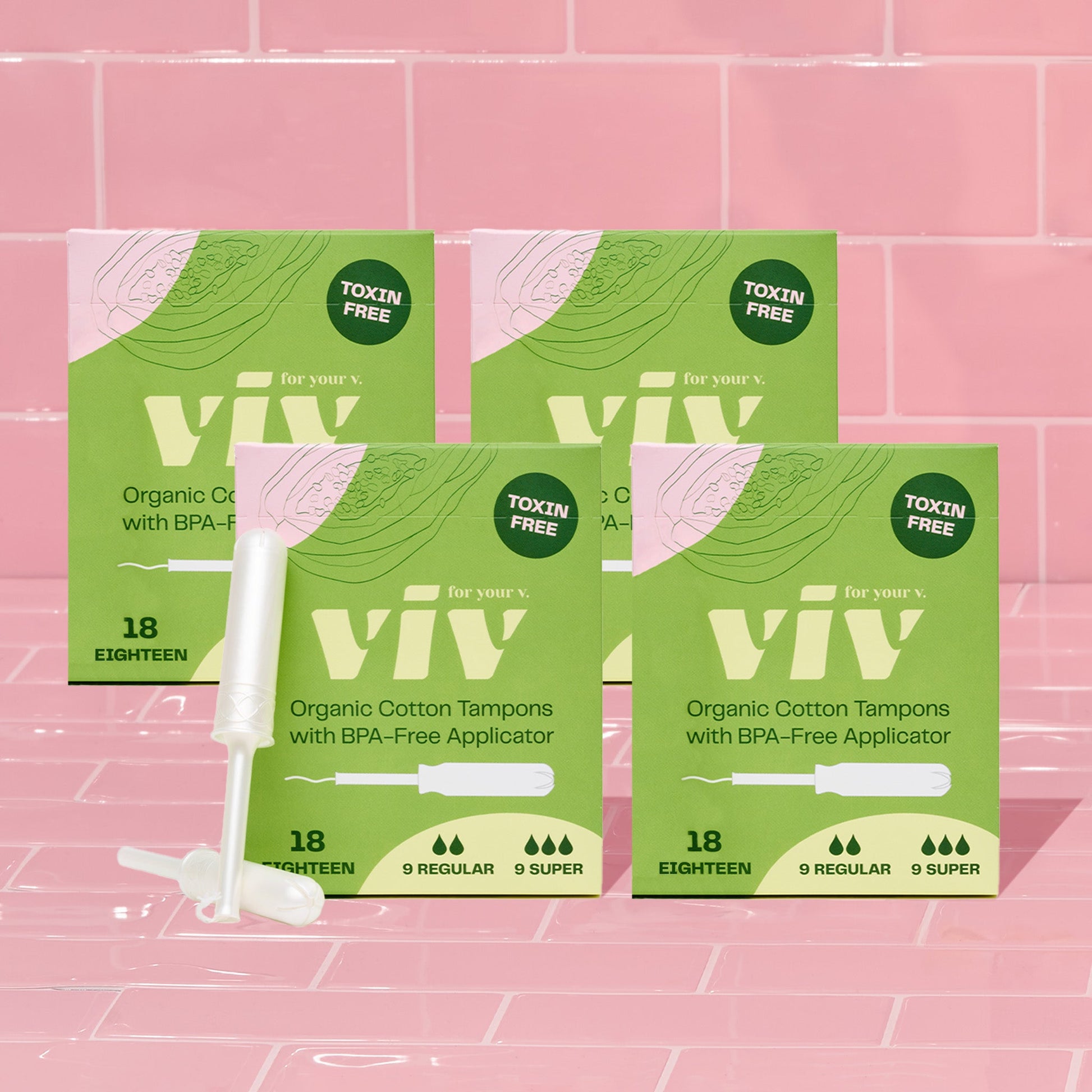 Viv tampons are completely toxin-free, made of 100% organic cotton with an ultra smooth BPA-free applicator. Viv tampons cut out the harmful chemicals, heavy metals, and uncomfortable plastic, giving you a safe, healthy, & earth-friendly period.
